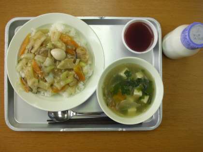 「中華丼、にらと豆腐のスープ、ぶどうゼリー、牛乳」です。