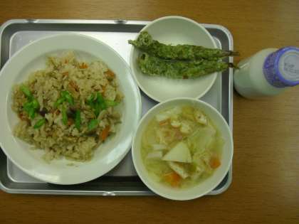 「きのこごはん、ししゃもの磯辺揚げ、みそ汁、牛乳」です。