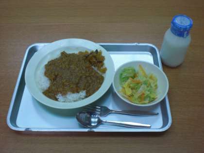 今日の給食は、キーマカレーライス・福神漬・きゃべつサラダ・牛乳です。