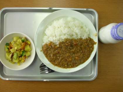 「キーマカレーライス、さつまいもサラダ、牛乳」です。