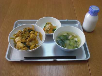 今日の給食は、キムチ丼・わかめスープ・シャキシャキ野菜・牛乳です。