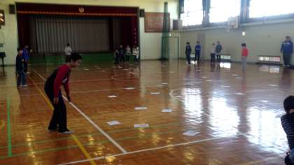 六年生は体育館で手作り大カルタ大会をしていました。