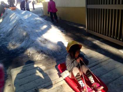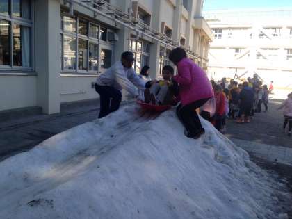 四年生位になるとやりたい気持ちを抑え、楽しそうに滑る下学年の子どもたちを笑顔で見ているようになります。三年生までの子どもたちは歓声を上げながら、嬉しそうに滑っています。長い列を律儀に守りながら…。
