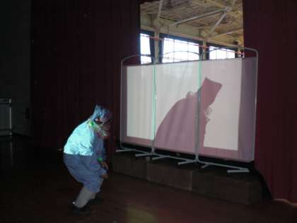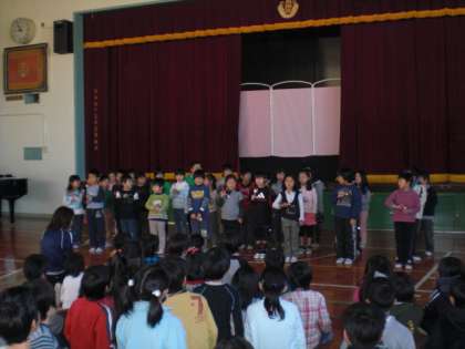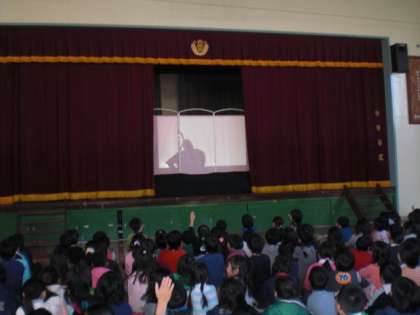 12月24日(木)の朝、児童集会で「シルエットクイズ大会」を行いました。先生たちが、海賊・ピエロ・トナカイなど、いろいろな扮装をこらしたものを影絵のようにして映し出しました。それを見た子ども達が、影に映っている先生は誰なのかを答えるというものです。大変楽しく集会を行うことができました。また、集会の最後には、1年生が12月になって練習したハンドベルの演奏や合唱を披露してくれました。