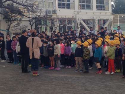 全校ではじめの会を校庭で行いました。校長の話の後、町会長さんが安全に実施できますようにと願って下さいました。