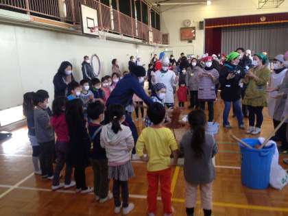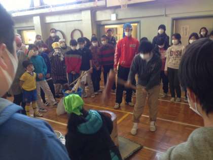 その後、餅つき会場となっている体育館に学級毎に行き、一人ずつ杵を突いてきました。みんなの掛け声と笑顔で会場が温かくなりました。突き手 としてお父さん、いぶき会の皆様、BOPの方々がたくさん来て下さいました。