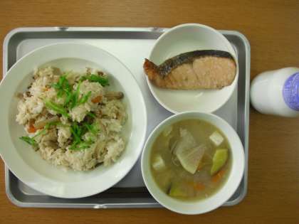 「炊き込みごはん、魚の照り焼き、さつま汁、牛乳」です。