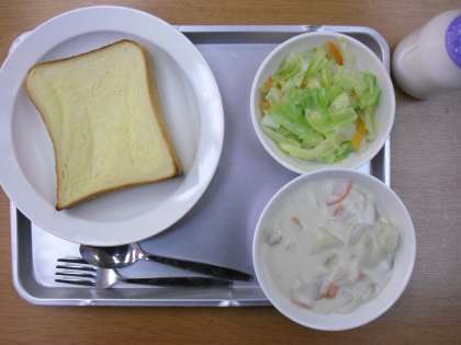 「フレンチトースト、クリームシチュー、キャベツサラダ、牛乳」です。