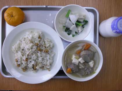 「豆ごはん、かぶの甘酢かけ、いわしのつみれ汁、ぽんかん、牛乳」です。