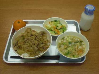 今日の給食は、豚丼・みそ汁・野菜の甘酢かけ・くだもの・牛乳です。