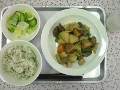 「じゃこと青のりのごはん、筑前煮、野菜のごま風味、牛乳」です。