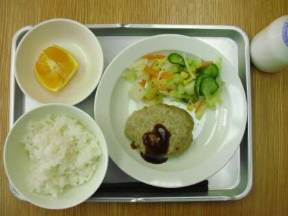 「ごはん、ハンバーグ、ポテト入りフレンチサラダ、清見オレンジ、牛乳」です。