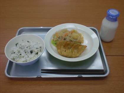 今日の給食、わかめごはん・ジャンボぎょうざ・春雨サラダ・牛乳です。これは、2年生のリクエスト給食です。