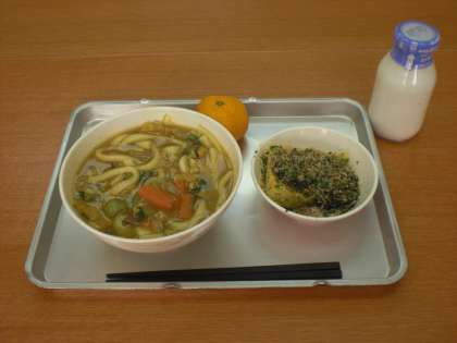 今日の給食は、カレーうどん・お好み焼き・くだもの・牛乳です。