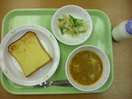 「フレンチトースト、ハンガリアンシチュー、アスパラガスのサラダ、牛乳」です。