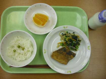 「グリンピースごはん、魚の立田あげ、野菜のからしじょうゆかけ、清見オレンジ、牛乳」です。