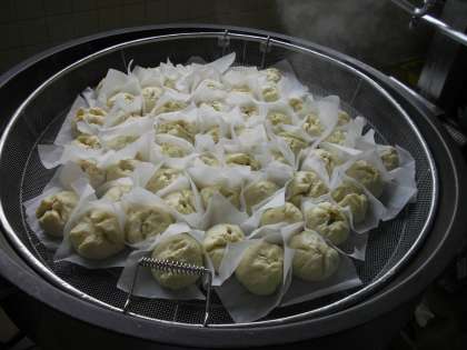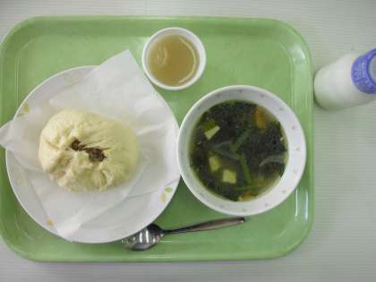 きょうはオリンピック給食の日です。肉まんは、中国料理の点心です。点心とは、おつまみ(軽い食べ物)という意味があり、しゅうまいやぎょうざ、春巻きなどの甘くないものと、ごま団子や杏仁豆腐などの甘い点心まで、いろいろあります。点心は日本には、室町時代に伝わり、朝食と夕食の間に食べる虫休めの品とされました。給食室で皮から手作りし、中の具を1つ1つ包みました。回転釜で蒸し上げ、おいしく出来上がりました。