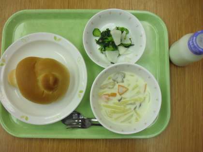 「ミルクパン、マカロニのクリーム煮、野菜のレモンかけ、牛乳」です。