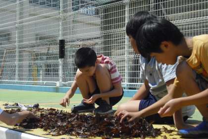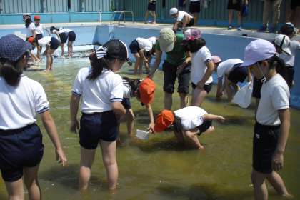 昨日(5月26日)午後から、2年生、3年生、5年生が合同で、プール清掃前の水抜きしたプールに入り、やごを救出しました。救出しないと下水に流され立派なトンボにならずに死んでしまいます。朝、家から虫網をもってきた子供が多く、夢中で救出していました。いるは、いるはたくさんとれました。