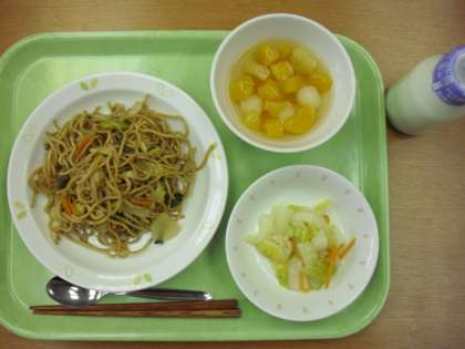 「ソース焼きそば、辣白菜、フルーツ白玉、牛乳」です。