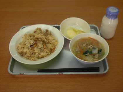 今日の給食は、中華おこわ・白菜と春雨のスープ・くだもの・牛乳です。