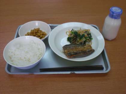 今日の給食は、ごはん・魚のかばやき風・おひたし・ぶどう豆・牛乳です。