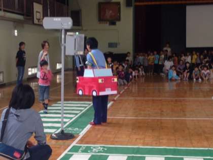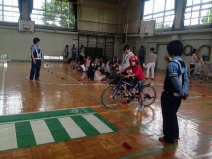 はじめは、子供たちの興味関心を引き付けるビデオ観賞、後半は実際に歩いたり自転車に乗ったりの訓練でした。