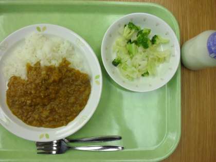 「キーマカレーライス、ブロッコリーのサラダ、牛乳」です。