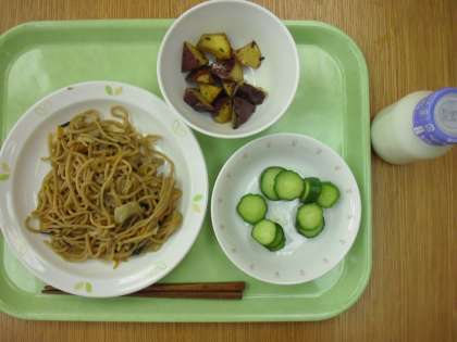 「五目焼きそば、きゅうりの甘酢かけ、大学いも、牛乳」です。