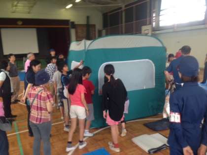 6年生は、体育館で段ボール仕切りの作り方やプライベートルームの作り方を教えていただきながら実際に作りました。さらに、AEDの使い方の訓練も受けました。