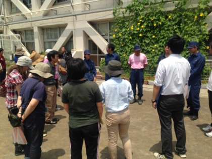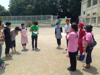 引き渡し訓練後の校庭では、町会の方々とPTAの方々、教員とが、発災時の各担当毎に分かれて顔合わせや担当の仕事確認をしました。