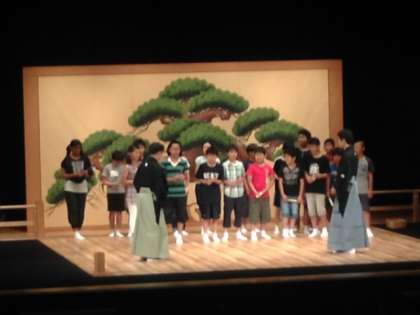 区内10校が集まり、狂言「附子」を鑑賞してきました。代表児童が舞台に乗り、動作や声の出し方も教えていただきました。