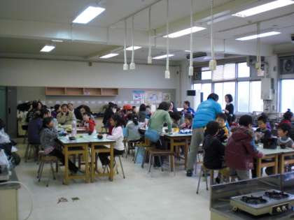 ドッジボールが終わった後は、みんなで持ち寄った材料を使ってPTAの皆さんが「お楽しみ汁」を作ってくれました。とても寒い日でしたが、このお楽しみ汁のおかげで参加した皆さん全員、身も心も温めていました。