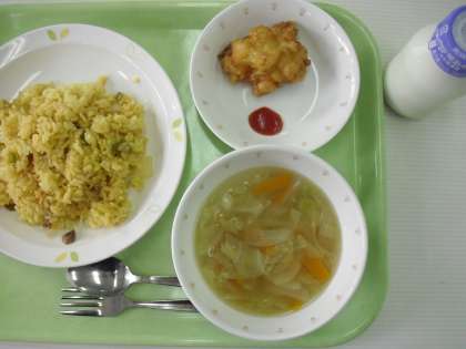 「カレーピラフ、キャベツスープ、大豆とコーンのフリッター、牛乳」です。