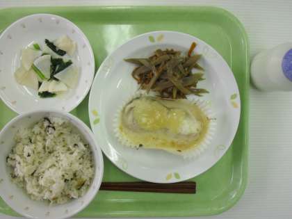 「菜めし、魚のみそマヨネーズ焼き、きんぴらごぼう、かぶの甘酢かけ、牛乳」」です。