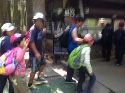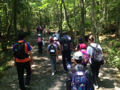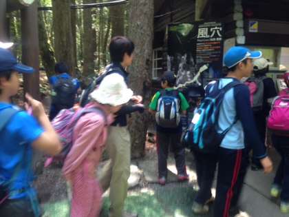 ハイキングの初めは、青木ヶ原樹海の鳴沢風穴の見学です。富士山の噴火で出来た風穴、一歩踏み込むとマイナスの冷凍庫。長い氷柱も見え、初めての子供たちはびっくりしていました。