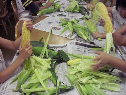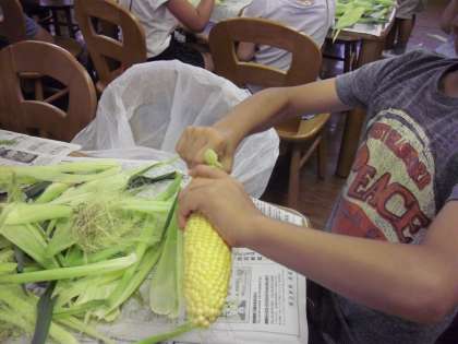 きょうは、2年生が1時間目の生活科の授業で、給食のとうもろこしの皮むき体験をしました。ひとり2本づつ、ていねいにむいてくれました、給食室でおいしく蒸し上げ、児童に届けられました。とうもろこしの栄養は、おもに体の調子を整えてくれます。ビタミンB群を含み、成長に必要な葉酸や、食物繊維が多いです。おやつにもぴったりです。