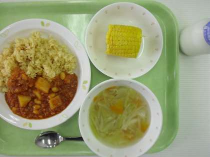 「チリビーンズライス、ベーコンと野菜のスープ、蒸しとうもろこし、牛乳」です。
