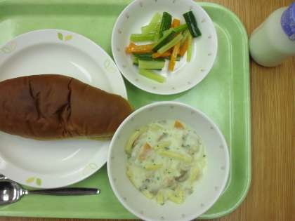 「黒砂糖パン、マカロニのクリーム煮、ピクルス、牛乳」です。