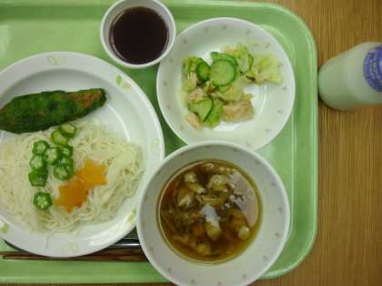 きょうは、1日早く七夕の行事食です。7月7日は、五節句の1つ「七夕」です。宮中での神事で「そうめん」を七夕に供えたという記録があります。もともと七夕には「索餅」という縄のように編んだ小麦粉のお菓子をお供えして無病息災を願っていました。それが後に「そうめん」になったといいます。