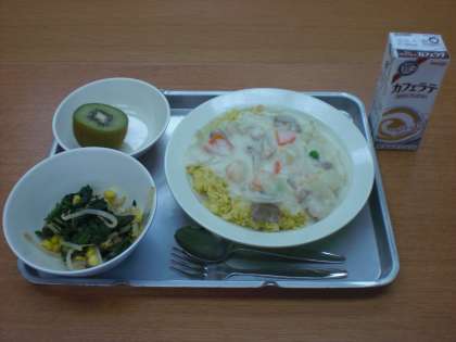 今日の給食は、ドリア風・ほうれん草サラダ・くだもの・リクエストの飲み物です。写真はカフェラテですが、ほかにはリンゴジュースとオレンジジュースがあります。みな自分の好みで選んでいます。