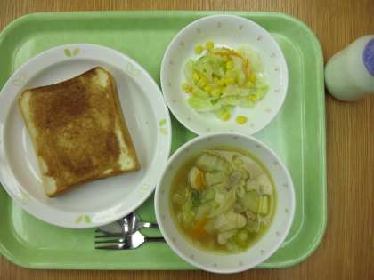 「シナモントースト、白いんげんの田舎風スープ、コーンサラダ、牛乳」です。