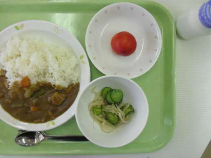 きょうのカレーには夏が旬のなす、さやいんげんなどの野菜がたくさん入っていました。きゅうりもプラムもこの時期が旬の食べ物です。旬の食べ物はみずみずしく、おいしく、栄養価も高いので、家でもぜひ食べてほしいと思います。