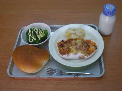 今日の給食、ミルクパン・魚のピザ風・コーンポテト・ゆでブロッコリー(マヨネーズ添え)・牛乳です。