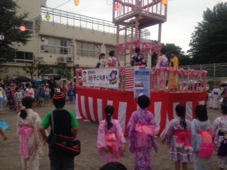 音楽クラブの演奏、すみれ会の皆様中心の盆踊り、6年生のダンスリーダー率いるダンス、中学生のボランティア、児童館やスポーツチーム、いぶきの会、町会、同窓会、学校職員のお店…。みんなの力を結集したこどもまつりで今年も盛り上がりました。