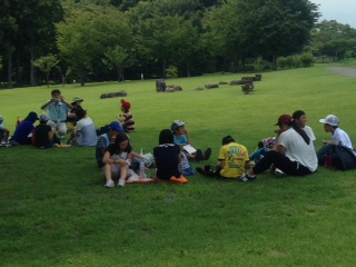 順調に着き、今は大谷川公園での昼食が終わりました。見渡す限りの青い空、緑の芝生、蛙が合唱するあぜ道、透き通る小川。暑くても、この大自然の中を思う存分駆け回る子供たち。
