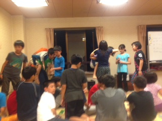 夕食の後は、広間でお楽しみ会をしました。日光クイズ、班対抗ゲーム大会、最後に担任得意の怖い話…と楽しみました。