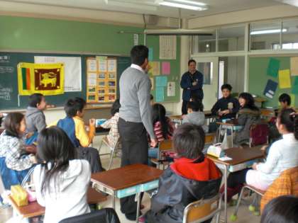 はじめは、あいさつの言葉を教えてもらいました。それから、子ども達の代表的な遊び方や食べ物、流行しているスポーツ、買い物の仕方、伝統的な服装など、いろいろなことが学習できました。授業が終わった後も、一緒に遊んだり、給食を食べたりして過ごしました。とてもよい交流ができた時間になりました。