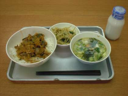 今日の給食は、キムチ丼・わかめスープ・もやしのごま風味・牛乳です。