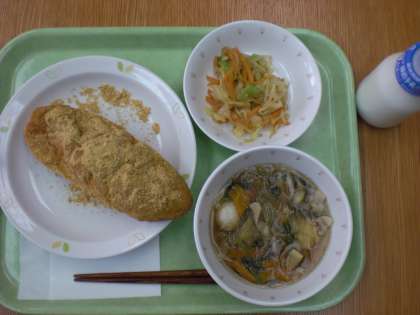 「あげパン、春雨スープ、野菜の中華風味、牛乳」です。